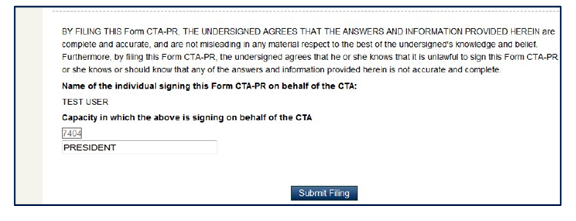 The Form PR must be submitted by a representative duly authorized to bind the CTA. This representative will be asked to electronically sign an oath or affirmation prior to submission.